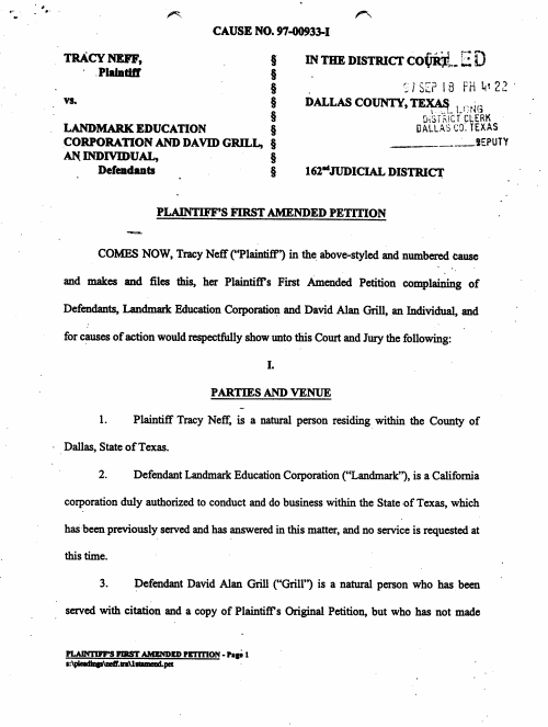 Endnote: Landmark Education settled this lawsuit before trial for a substantial sum, which was paid to plaintiff. As part of the settlement agreement the plaintiff and her attorneys agreed not to speak further about the suit and many documents were sealed--thus blocking them from public view. This complaint remains part of the public record.