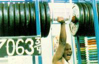 Inside the entrance there's a picture of the grimacing Sri lifting a barbell with one arm; the caption says it weighed 7,063 pounds. That's right--7,063 pounds. With one arm. The Sri has lifted elephants and airplanes with one arm too. A man with a beer belly looks at the picture and says "So how come this guy isn't in the Guinness book of records?"