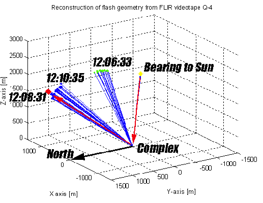 All the Waco flashes are clear examples of solar reflections (except for some that are thermal reflections of the fire [13] and others that reflect a tank's hot exhaust panel [16] ). One example: the first two images below are from the Waco FLIR. The second shows a flash that appears in a window at 12:08:31 pm. [17] The third image, a visible-light photo, shows the same window close-up, which is at the end of the collapsed gym catwalk. McNulty's videos claim that this flash is an FBI bomb exploding inside Mt Carmel seen through a window. Yet the third image shows that the window was flat on the ground. The next graphic from the Klasen- Madsen report [6] shows that at 12:08:31 the aircraft (red box) was in the exact position necessary to intersect a beam of reflected solar energy (red arrow) coming from a specular solar reflection on the fallen window, which the moving FLIR sensor would record as a flash.