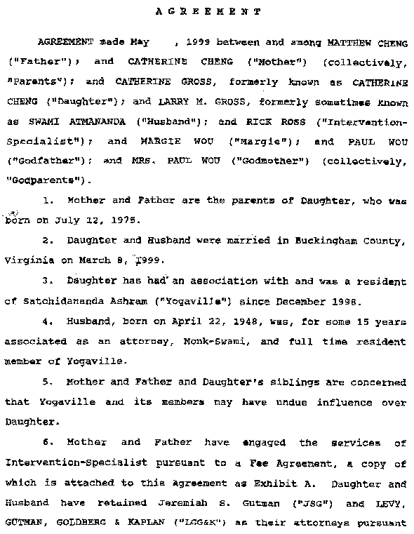 Note: Despite statements made by Catherine Cheng (now called "Meenakshi" Gross), her husband Larry Gross (aka "Sundaram") and leaders at Yogaville, which claim Catherine and Larry are no longer associated with Yogaville--a letter posted March 2001 on the Yogaville Web site proved otherwise. Both "Meenakshi" and "Sundaram" were listed prominently amongst "20 Western devotees" who "came [to India] to pay respects to Sri Gurudev [aka Swami Satchidananda]...with offerings" at a celebration attended by Yogaville's supreme leader. Shortly after their trip to India, Larry Gross and Catherine Cheng moved back to Swami Satchindananda's community and are now once again residents of Yogaville. Larry continues to handle legal matters for Yogaville and its interests. He also solicits business from the mainstream Hindu community within Virginia. "Meenakshi Sundaram" (aka Catherine Cheng) has become a "Certified Integral Yoga Hatha Teacher" and conducts classes at a center not far from Yogaville, in the nearby town of Buckingham, Virginia.
