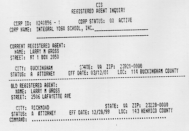 Integral Yoga School, Inc. -- Larry Gross, registered agent