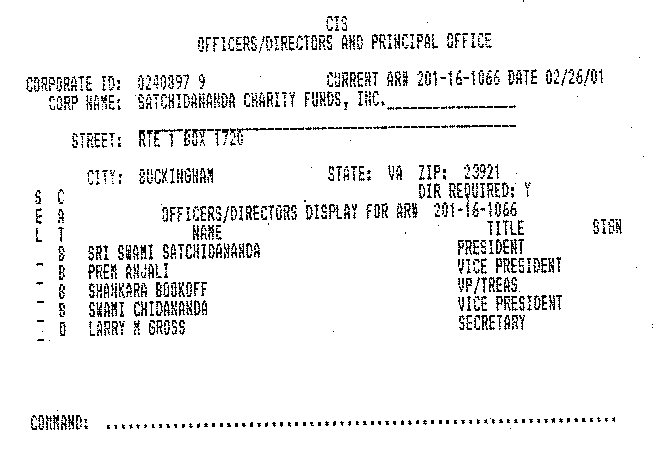 Note: Larry Gross claims that he disassociated himself from Yogaville after his controversial marriage to Catherine Cheng. However, since his supposed "letter of resignation" (dated April 1999) he clearly continues to hold official positions within Yogaville's enterprises according to official records.