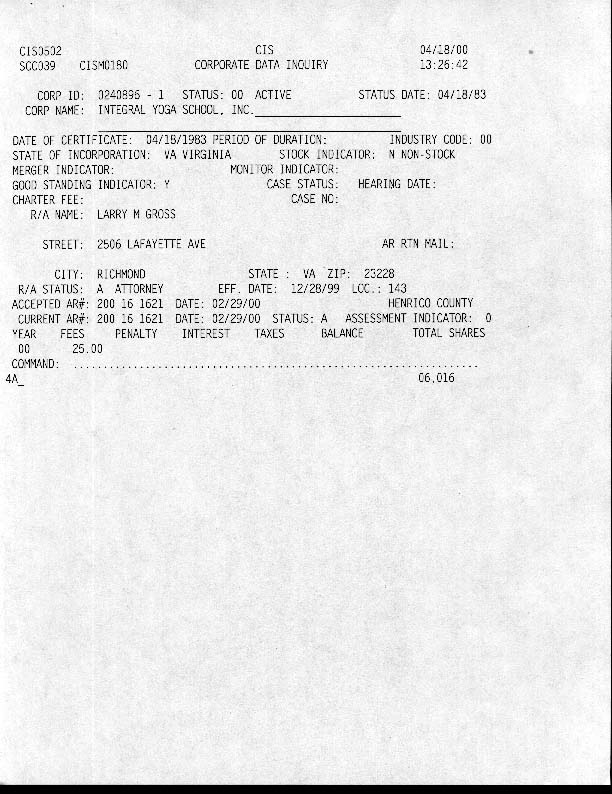 Note: Larry Gross claims that he disassociated himself from Yogaville after his controversial marriage to Catherine Cheng. However, since his supposed "letter of resignation" (dated April 1999) he clearly continues to hold official positions within Yogaville's enterprises according to official records.